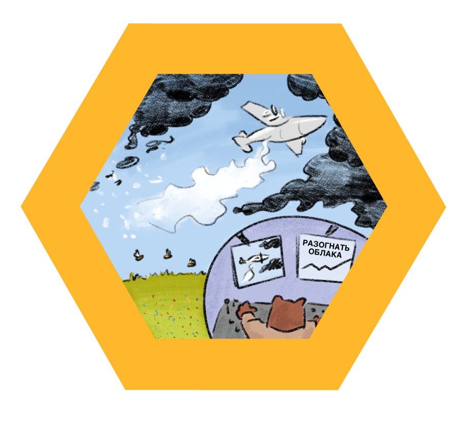 Дроны самолётного типа на Берлоге разгоняют облака или наоборот — стимулируют конденсацию влаги и вызывают дожди. Медведь за пультом управляет десятками таких дронов, меняя погоду через координацию множества устройств, составляющий киберфизическую систему: объединенные общей физической моделью и системой сбора и анализа данных, множество датчиков и систем беспилотников управляют погодой над огромными массивами суши.